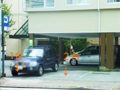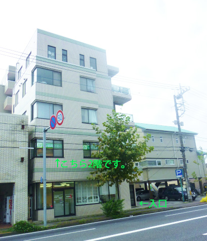 駐車場は青の「P」マークが目印です。写真のように専用駐車場2台ございます。事務所は平成通り沿いの建物2階です。一条2丁目の交差点を西へ約200mです。