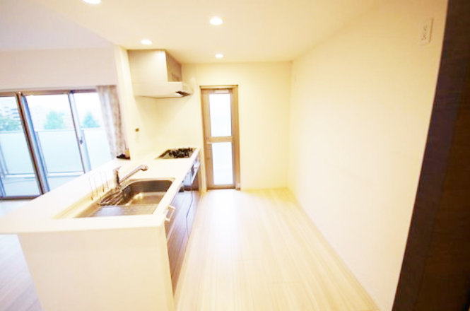 キッチン 勝手口付きです。明るい空間でリビングで遊ぶお子様を見ながら楽しくお料理できます。