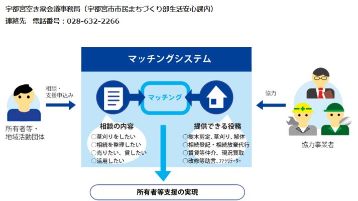 平成29年4月28日に、宇都宮市内において空き家・空き地対策に取り組む官民連携組織となる「宇都宮空き家会議」が設立されました。 この組織における業務のひとつとして、所有者等の「草刈りをしたい」「空き家を売却したい・解体したい」などの相談内容に応じた樹木剪定業者や解体事業者などの『協力事業者』を紹介する業務に取り組んでいます。 その他にも、「空き家の名義変更をしたい」や「空き家を有効活用したいがどうしたらよいか分からない」などの相談にも対応しています。 空き家・空き地の管理や活用にお困りの所有者の方はぜひ「宇都宮空き家会議」にご相談ください。生活安心課内に窓口ございます。市役所2階です!☏電話番号:028-632-2137