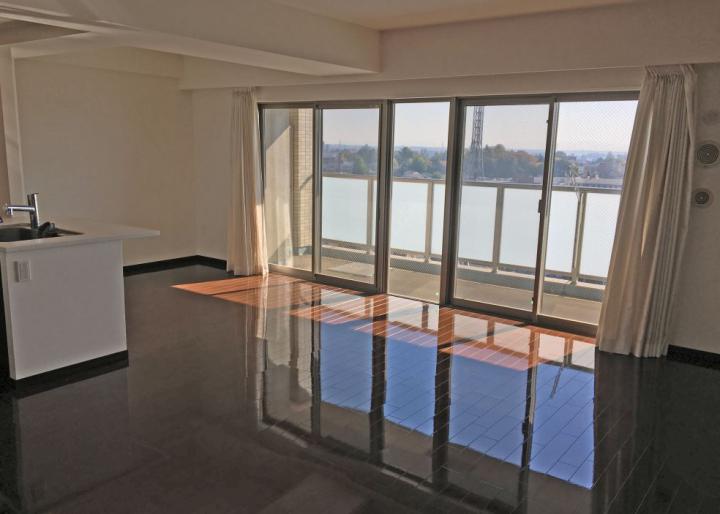 約21.7帖の上質な空間が広がります。コーティング剤のフローリングは光を天井へ反射する程きれいです。