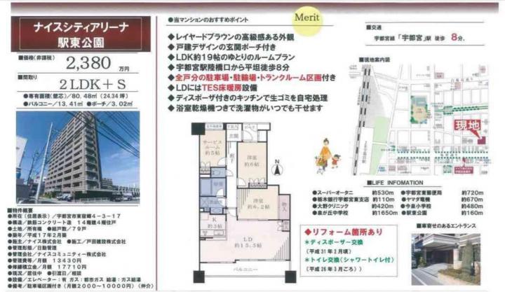 価格変更しました。是非ご内覧ご予約ください。 ナイスシティアリーナ駅東公園4階 2LDK+S 80.48㎡の広々とした居住空間が広がります。🌸 LRT停留所至近の物件です。LDK約19帖ございます。ダイニングテーブルやソファのレイアウトなど広々とした居住空間を利用して多彩にお楽しみ頂けます。 また、住環境良好な立地です。 【特徴ピックアップ】 床暖房・浴室暖房乾燥・トランクルーム・ディスポーザー・玄関ポーチ付き・ ■ローソン 目の前です。 ■駅東公園 が約160m宇都宮駅東側に位置する「宇都宮駅東公園」。四季折々の自然を楽しめる公園で、特に秋にはイチョウ並木のトンネルが美しいことでも知られています。 ■スーパーオータニ約530m(足利銀行ATM有)■大野クリニック約420m■カンセキ約400m(日用品のお買い物に便利です)■宇都宮東郵便局約720m■今泉小学校約480m■栃木銀行東支店約110m ■カフェトラ約200m■山泉楼約450m(ランチにお粥付きのセットがございます) 現在居住中の物件です。ご内覧は事前のご予約をお願いしております。