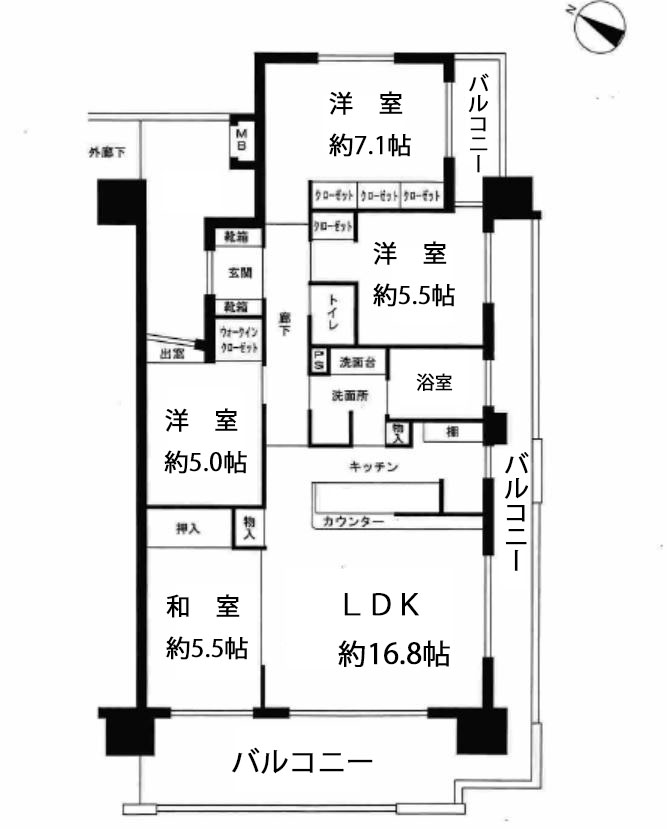 専有面積約85.04m2・間取り 4LDK( 洋5.7.1 洋 5.5 和5.5 LDK16.8)主寝室にクローゼット、バルコニー付です。・和室押入あり・子供部屋クローゼットあり・洗面室リネン収納あり 奥様がうれしい収納力が豊富な物件です。