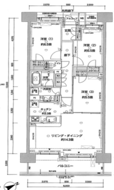 3LDK(LDK約17.6帖・洋室6.5帖・洋室約5.5帖・洋室約5.5帖)専有面積76.73平米
