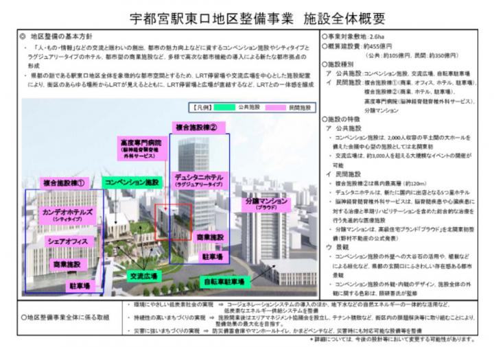宇都宮駅東口地区整備においては、広域かつ多様な交流、賑わいの創出と、これによる都市の競争力や地域経済の活性化などに資する高次な都市機能の集積に向け、民間の有する企画力・資金力などを最大限に活用したPPP(公民パートナーシップ)によるまちづくりを進めるため、平成30年1月に本市の地区整備に関する基本方針や導入機能などを示す「宇都宮駅東口地区整備方針」を策定しました。