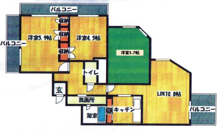 間取り図(3LDK、ペットと一緒にお住まい頂けます。(飼育細則有)LDK約12.8帖・洋室約5.9帖・洋室約4.5帖・洋室約5.7帖 壁芯68.05平米です。)