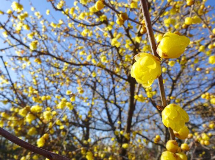 花🌸 ・・蝋梅(ろうばい)蝋細工のようなつやつやとした花の質感が特徴です。甘い香りがします。 ロウバイ?子供の頃そのなんとも言えない重い、華やかさが感じられない、名称が印象に残っていました。実際は梅が黄色くなったようなかわいらしい花を咲かせます。