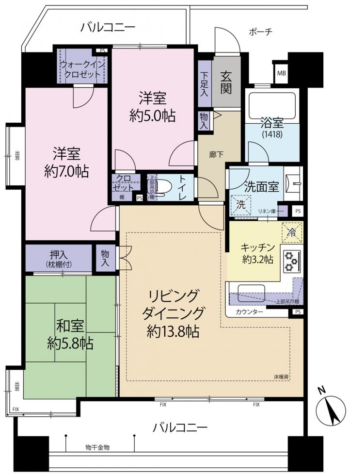 専有面積75.14m2・LD約13.8帖・K3.2帖・洋室5帖・洋室7.0・和室5.8帖