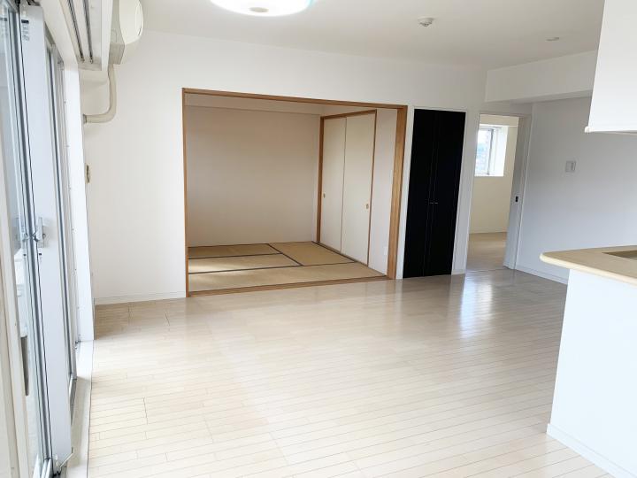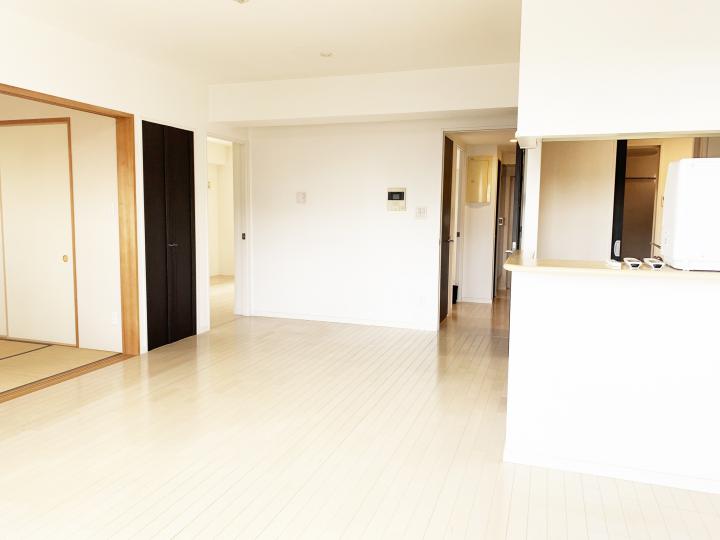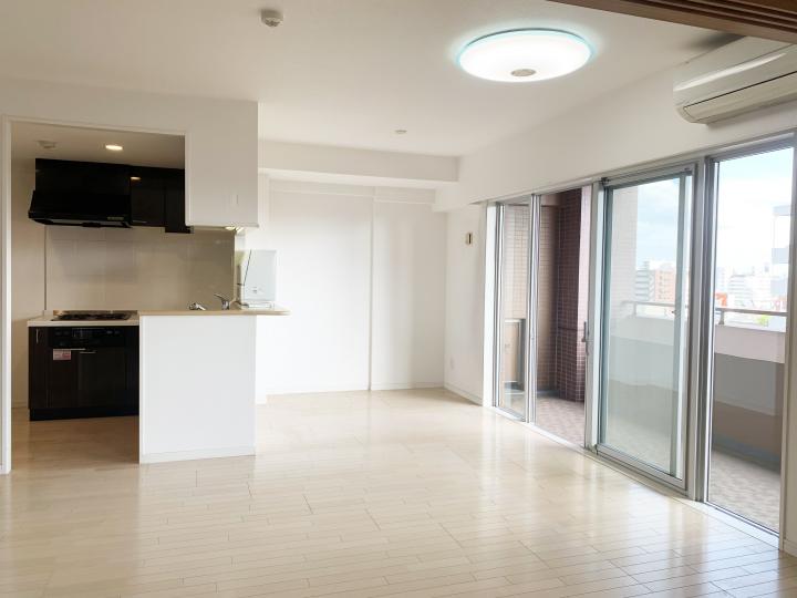 9階南西角部屋のお部屋は、南面バルコニーから明るい採光を感じられます。 空家です。お気軽にご内覧のご予約ください。