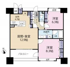 専有面積71.85m²(壁芯): 2LDK(洋 8.3・6.3 LDK 17.6)