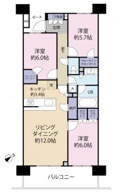 専有面積約75.30㎡ LDK約15.4帖・洋室約5.7帖・洋室約6.0帖・洋室約6.0帖
